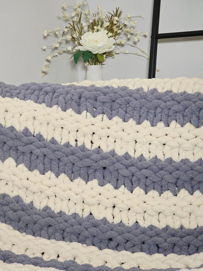 Blue & White Striped Handmade Chunky Knit Baby Blanket